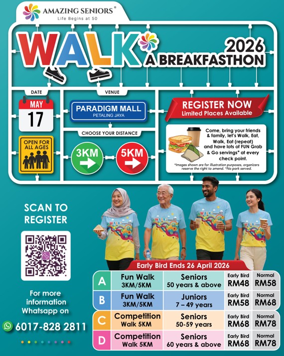 Walk-A-Breakfasthon 2026 is BACK! Not your usual walkathon..... WALK , EAT, WALK (REPEAT) Date: 17 May 2026 Time: 6.30am - 11.00am Venue: Paradigm Mall, PJ Choose your pace: A. Fun Walk (3KM / 5KM) and for all ages B. Competitive 5KM (Seniors 50+) and WIN cash and prizes up to RM10,000 What you get: -T-shirt and bib -Food at checkpoints -Finisher medal and e-certificate -Goodies bag and lucky draw *Early Bird ends 26 April! Limited slots! Register now! WhatsApp: 017-8282 811