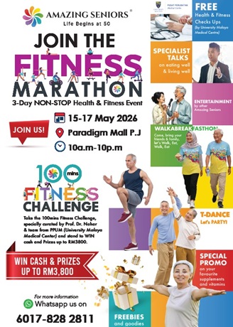 MARK YOUR DATES! Join the Fitness Marathon — From MAY 15th - 17th 2026 at Paradigm Mall, Petaling Jaya, a 3-day non-stop health & fitness event designed just for you! This year we are back with even bigger surprises this year and goodies too. You can expect to WIN loads of prizes, be CHALLENGED and LEARN all about living healthy and well. HIGHLIGHTS: -FREE Health Screening and Fitness Checks across 3 days -SPECIALIST TALKS on eating well & living well across 3 days a) WALKABREAKFASTHON on 17th May 2026 ONLY b) 100 mins Fitness Challenge throughout the 2 days - 16th May, Saturday 10.30am (Seniors 50 years & above) - 17th May, Sunday 3.00pm (Open for all) - Registration Fee RM20 only. c) Mah Jong Tournament - 15th May 2026, from 11.00am - Registration Fee RM20 only. d) Ping Pong Tournament - 15th May 2026, from 2.30pm - Registration Fee RM20 only. e) 24 Festive Drums Workshop - 16th May 2026, from 3.30pm (Open for all) - FREE workshop f) Line-Dancing - 15th May 2026 - FREE workshop BLOCK THESE DATES!!! PM us for more info at +6017 8282 811.